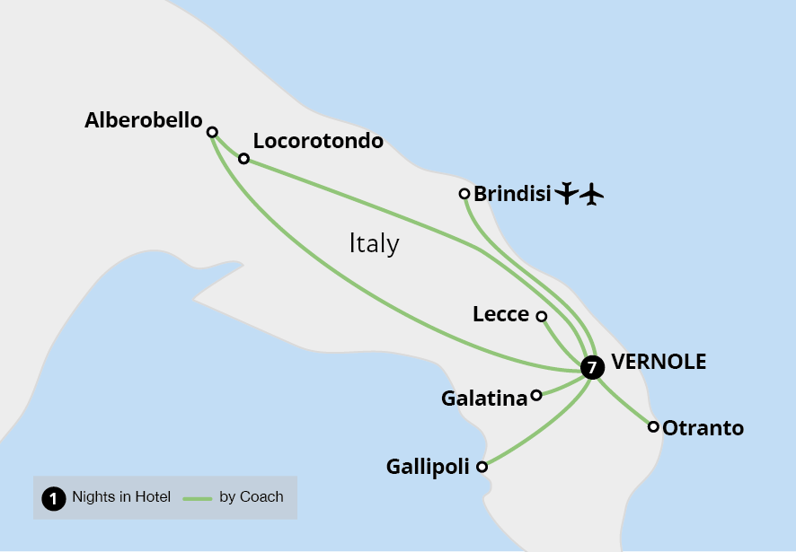Arriving by plane, enjoy our scenic base in a hotel overlooking the coast of Monopoli. From here, experience the incredible sights and traditions of Puglia, a place untouched by the hands of time. Rich with UNESCO World Heritage sites, discover the spectacular trulli homes of Alberobello and the sassi cave dwellings in the cliffside town of...