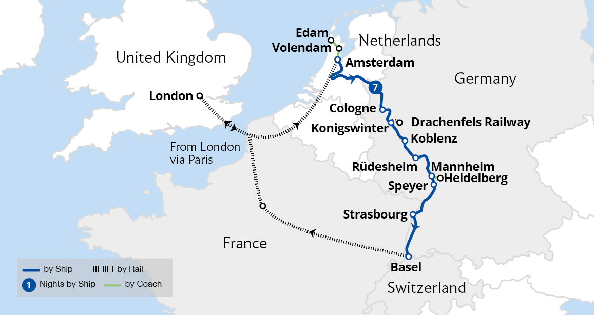 Experience the breathtaking beauty of the Netherlands to Switzerland on a luxury river cruise. Sail through four countries, admiring stunning forested valleys, charming half-timbered towns and historic cities lining the picturesque banks of this incredible river. Marvel at the spectacular scenery of the Rhine Gorge, a UNESCO World Heritage site...
