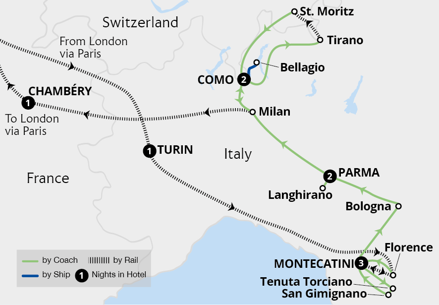 Explore iconic cities, delectable cuisine and remarkable scenery on this northern Italy holiday from three exceptional bases - Montecatini, Parma and Como. Travel through Tuscany to Florence and San Gimignano, where we witness centuries of art and architecture and learn about pizza and wine at a 300-year-old estate. Continuing to Emilia-Romagna,...