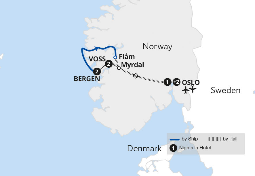 Experience the beauty of Norway from its natural wonders to charming cities on this tour across stunning landscapes. Journey through an impressive wilderness of plateaus and waterfalls on two of the world's most famous train journeys: the spectacular Bergen Railway and the cherished Flåm Railway. Marvel at towering cliff faces on a...