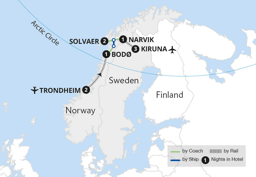 Beautifully scenic Scandinavian rail journeys take us from the ancient Viking capital of Trondheim to wintry Kiruna in Swedish Lapland, enjoying many opportunities to be dazzled by the ethereal Northern Lights. Travelling through amazing landscapes by rail, cross to the Arctic Circle to Bodø. From here, seek the ethereal Northern Lights on...
