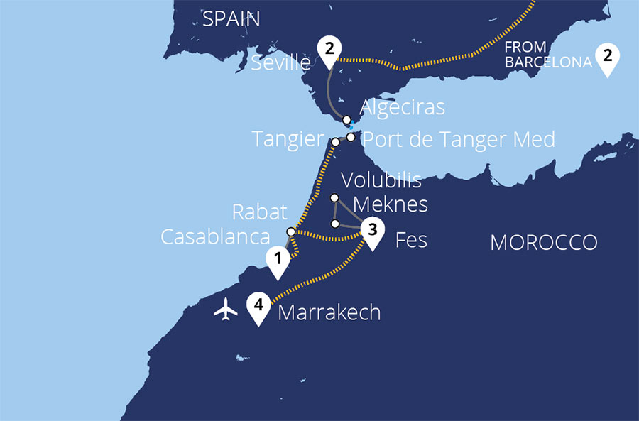 Follow the path of the ancient Moors from the shores of Spain to mystical Moroccan cities. Discover the diverse architecture of Barcelona, including Gaudí's iconic church, and the Andalucían city of Seville before crossing the Strait of Gibraltar to Morocco. Soak up Morocco's flavours in Casablanca, Rabat, Fes, Meknes and Marrakech, and...