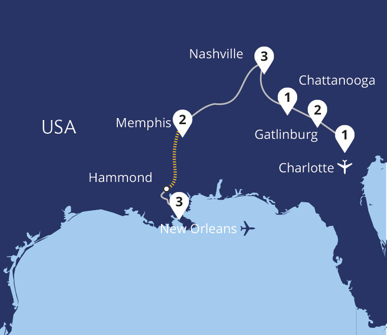 Historic tracks lead us on an unforgettable rail tour through the heartlands of great American music - from Nashville, home of country music, to the blues, soul and rock 'n' roll of Memphis and the expressive jazz of New Orleans. Starting our journey in North Carolina, we discover the music legends of Tennessee, then continue on the City of...