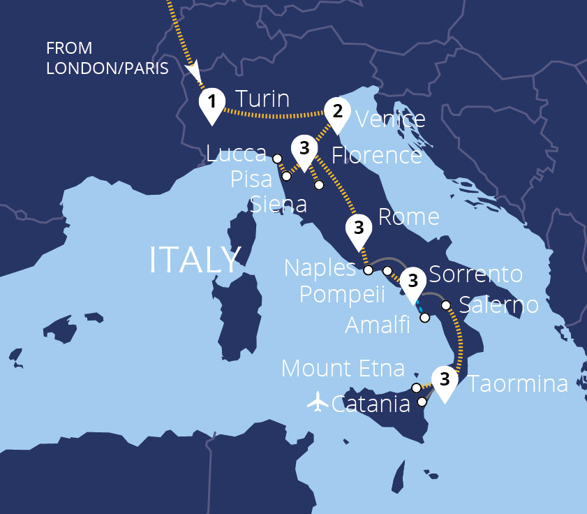 From the Alpine foothills to the island of Sicily and all that lies between, uncover the best of Italy. Travelling the country's length, we delve into the history and culture of Italy's remarkable destinations, including Venice, Florence and Rome. Bask in the beauty of the Amalfi Coast and marvel at the remains of ancient Pompeii before...