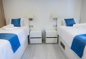 Cabins feature air-conditioning, a safe, an audio system, a wardrobe, desk, sofa, and a window. En-suite bathrooms include a shower and a hairdryer and beds can be configured to twins or a double.