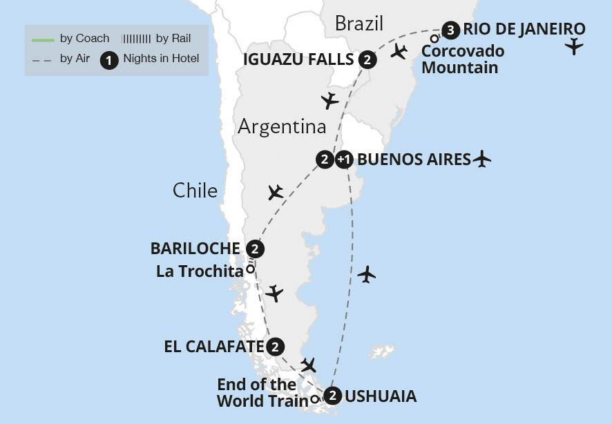 But the show doesn't stop there. Witness the breathtaking landscapes of Brazil, Argentina and Patagonia, the Swiss-style town of Bariloche and the wondrous Iguazú Falls, before unforgettable journeys on the legendary 'Old Patagonian Express' and the 'End of the World Train', plus a cruise to the astonishing Perito Moreno Glacier.