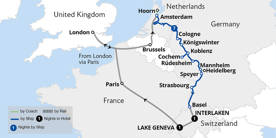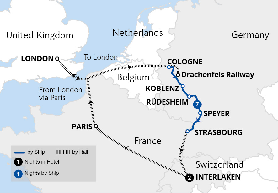 Enjoy one of the world's finest rail journeys aboard the legendary Glacier Express to Zermatt and admire Matterhorn views from the charming Gornergrat Railway. Descending the Alps, set sail on a sensational Rhine cruise, indulging in luxurious amenities and superb service. Enroute, savour incredible vistas of the stunning Rhine Gorge.