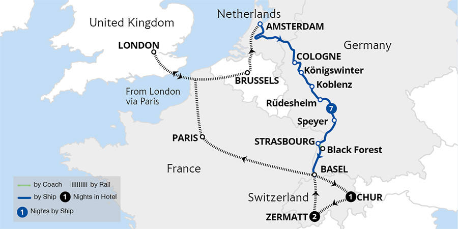 Enjoy one of the world's finest rail journeys aboard the legendary Glacier Express to Zermatt and admire Matterhorn views from the charming Gornergrat Railway. Descending the Alps, set sail on a sensational Rhine cruise, indulging in luxurious amenities and superb service. Enroute, savour incredible vistas of the stunning Rhine Gorge.