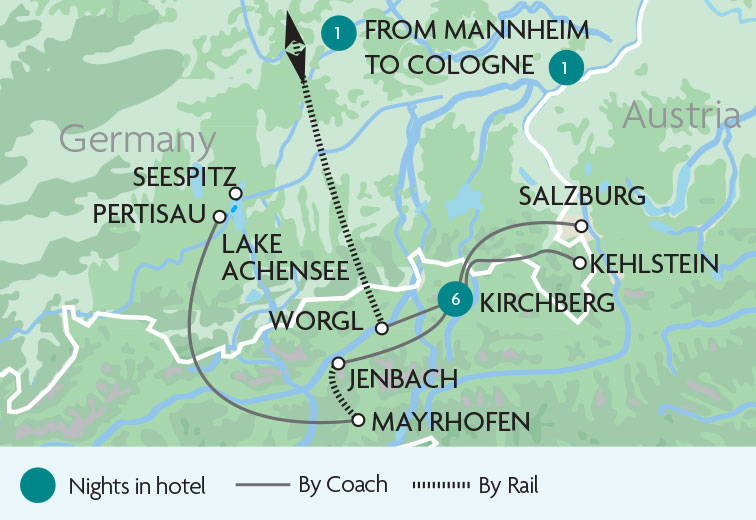 Experience amazing alpine views of mountains and lakes based in the charming Tyrolean town of Kirchberg on this GRJ all-inclusive holiday. Enjoy a tour of the musical city of Salzburg, the hometown of Mozart, and journey to a dramatic mountaintop retreat that played an infamous role in 20th-century European history. Travel by train...